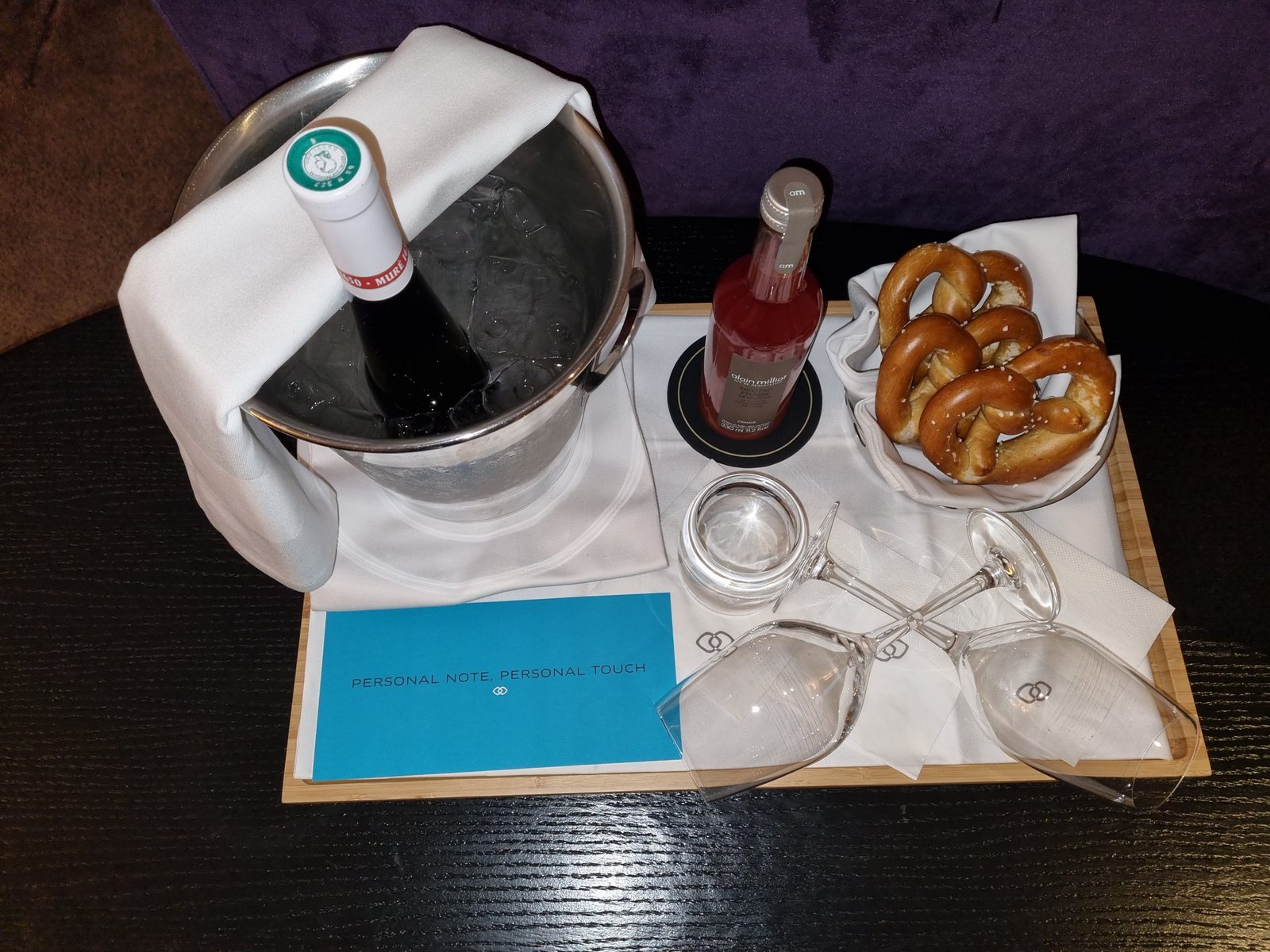 When we got back to our room after shopping, we found a handwritten note along with some snacks, juice, and a lovely bottle of wine. It was a nice surprise.